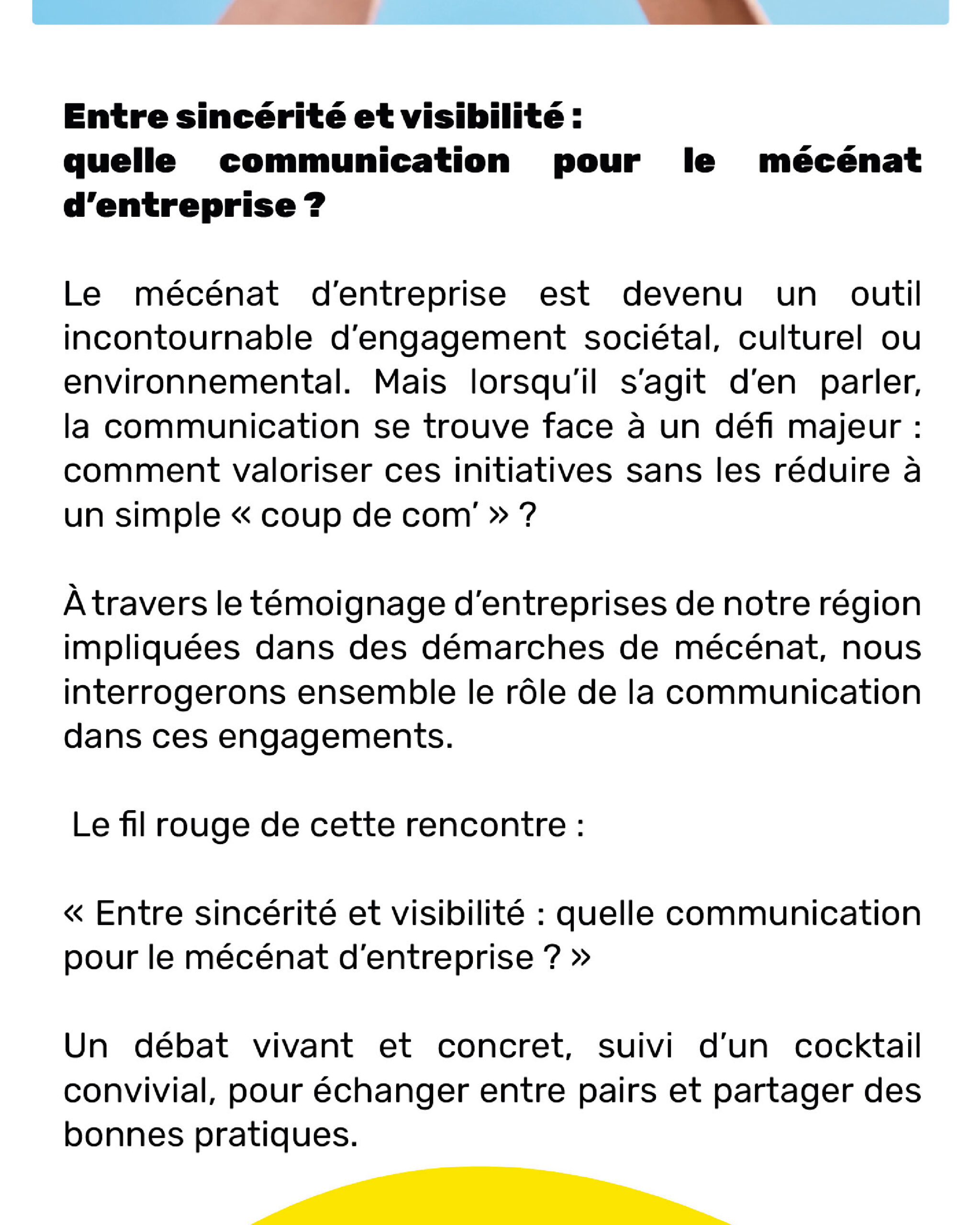 À travers le témoignage d’entreprises de notre région impliquées dans des démarches de mécénat, nous interrogerons ensemble le rôle de la communication dans ces engagements.