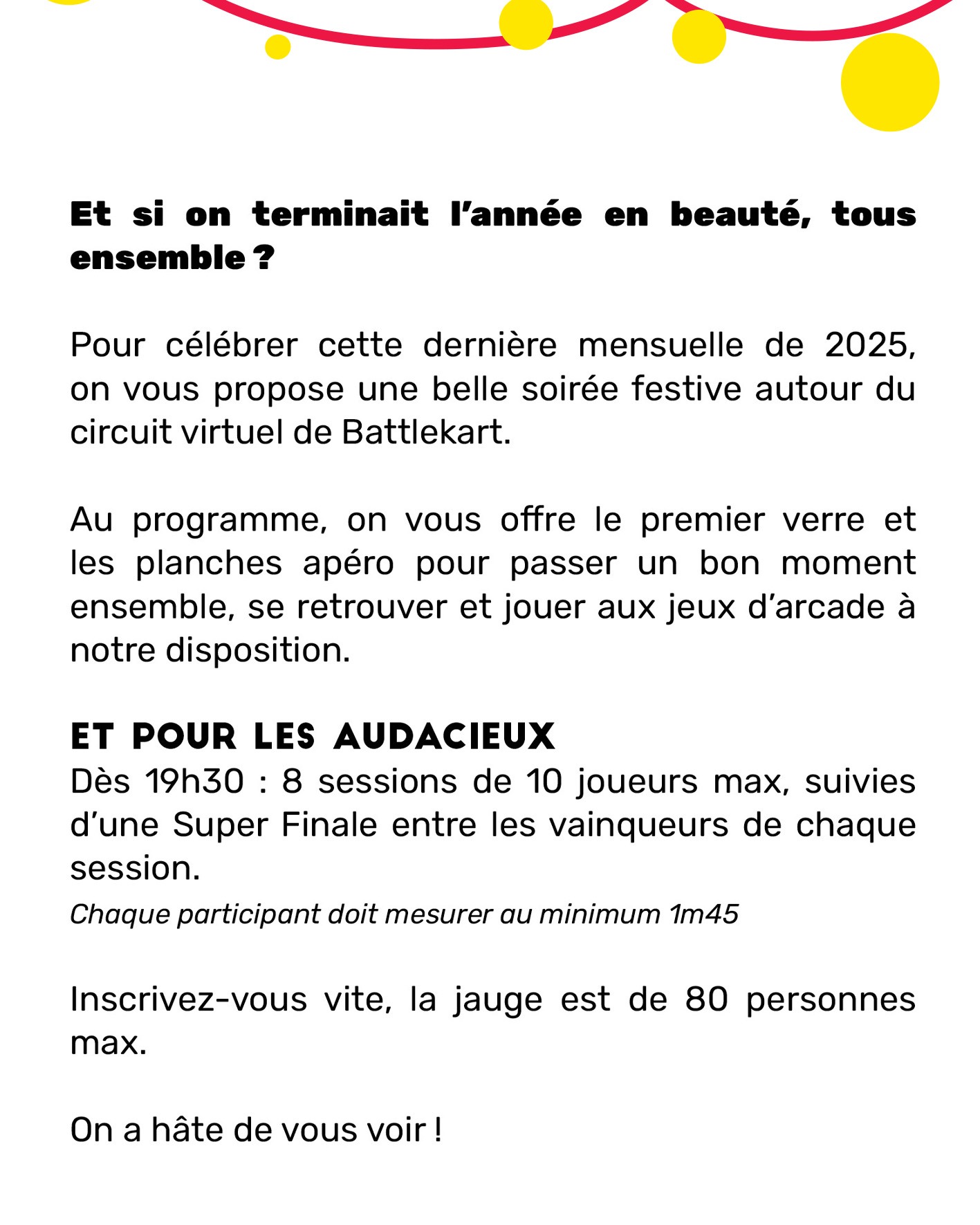 ✨Mardi 16 décembre, on clôture l’année ensemble… et cette fois, on file en piste chez BattleKart Dijon !
